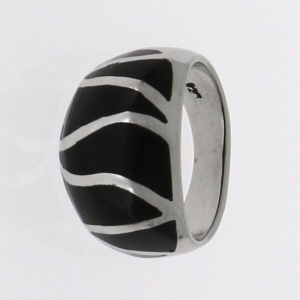 UncategorizedAnillo liso decorado con esmalte negro. 13.35 mm de ancho, disminuyendo a 4.10 mm.