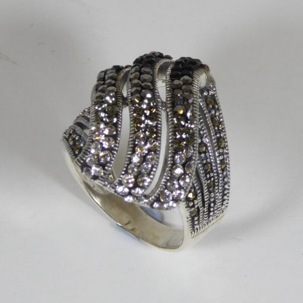 Anillo de marquesitas que combina circonitas blancas y negras.