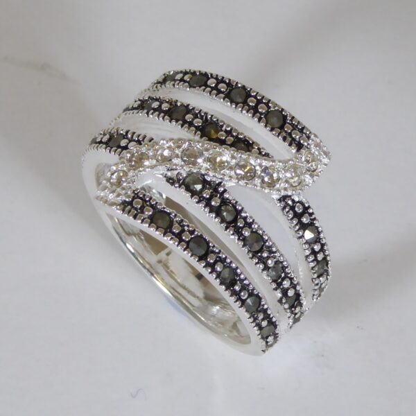 Anillo rodiado de marquesitas decorado con una tira de circonitas blancas de 2 mm.