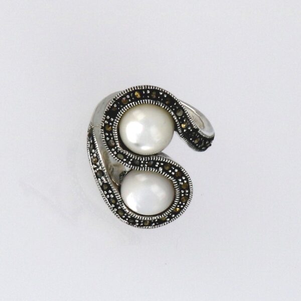 UncategorizedAnillo rodiado de marquesitas que rodea a dos piedras en color blanco de 9.45 mm.