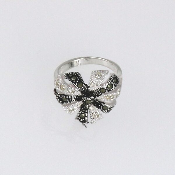 Anillo de marquesitas. Con forma de corazón, combinando tiras blancas y negras.
