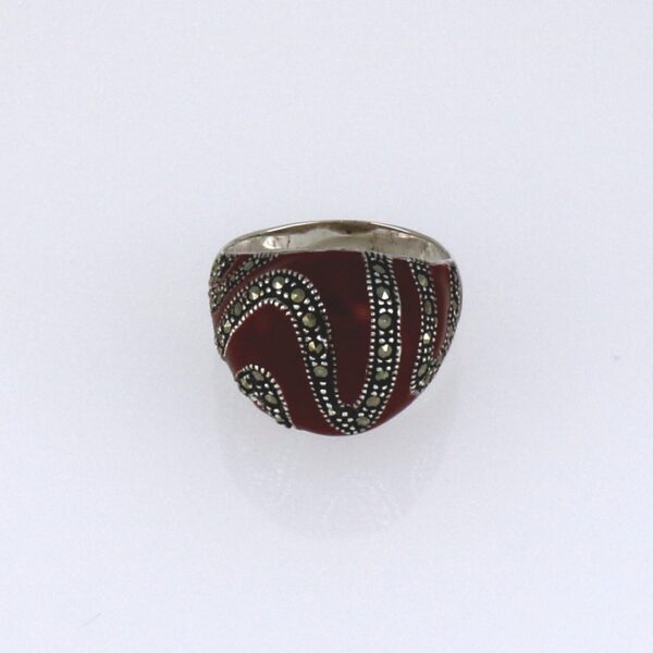 Anillo rodiado. Esmaltado en burdeos y decorado con ondas de marquesitas.