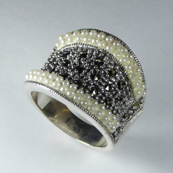 Anillo rodiado de marquesitas. Con dos filas de perlas.