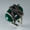 UncategorizedAnillo rodiado. Con piedra verde ovalada, decorada con tres tiras de marquesitas.