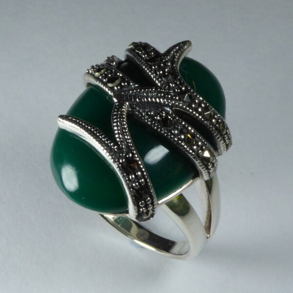 Anillo rodiado. Con piedra verde ovalada, decorada con tres tiras de marquesitas.