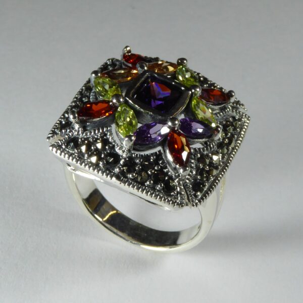 Anillo de marquesitas cuadrado. Decorado con circonitas de colores rubí, amatista, citrino y oliva.