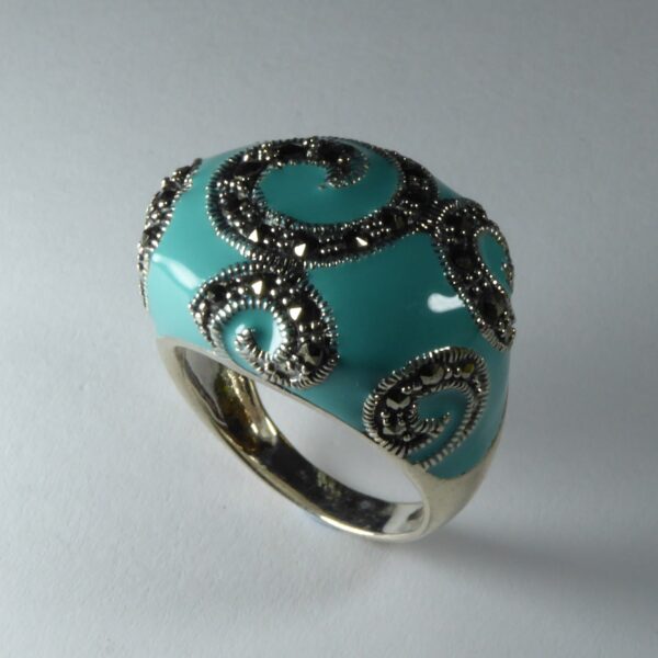 Anillo esmaltado en verde agua y decorado con marquesitas.