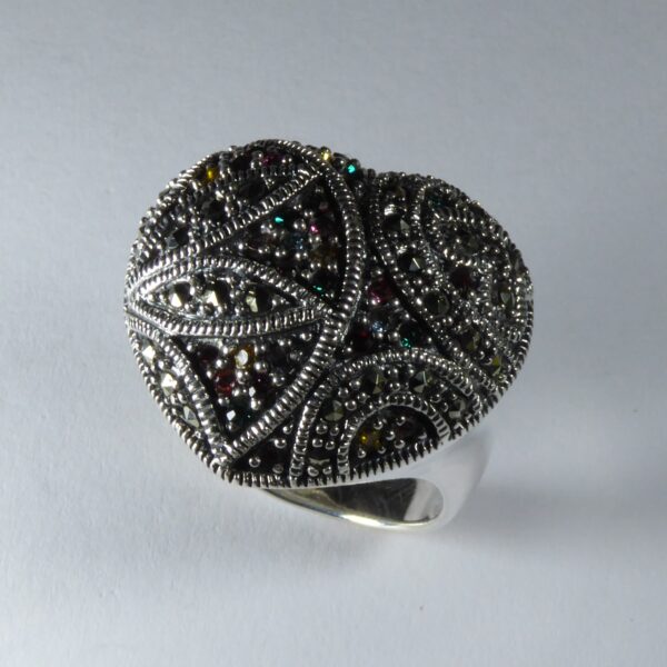 Anillo de marquesitas en forma de corazón. Decorado con circonitas de diferentes colores de 1 mm.