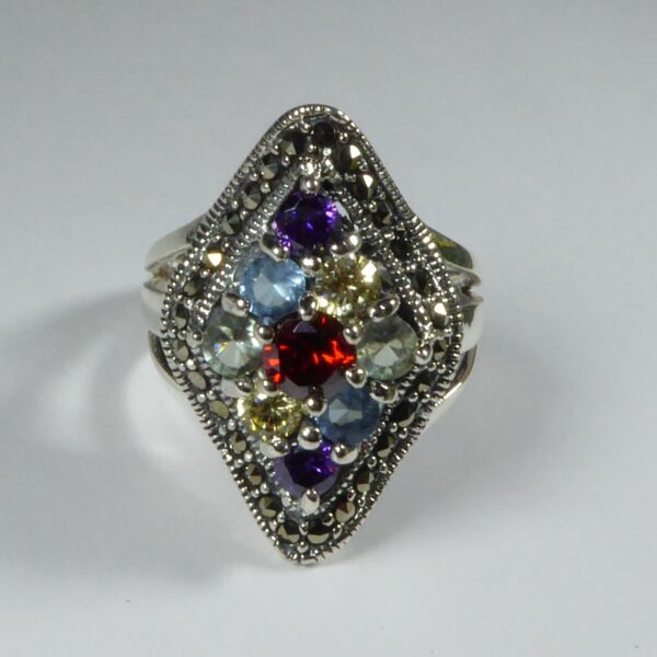 Anillo rodiado de marquesitas. Con forma de rombo y decorado de circonitas de colores, aguamarina, champagne, amatista y rubí.