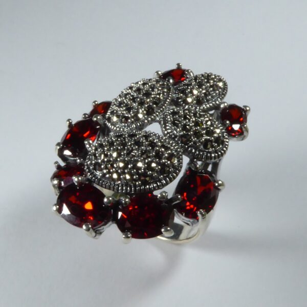 Anillo con formas ovaladas de marquesitas. Rodeadas de piedras de color rubí con diferentes formas y medidas.