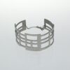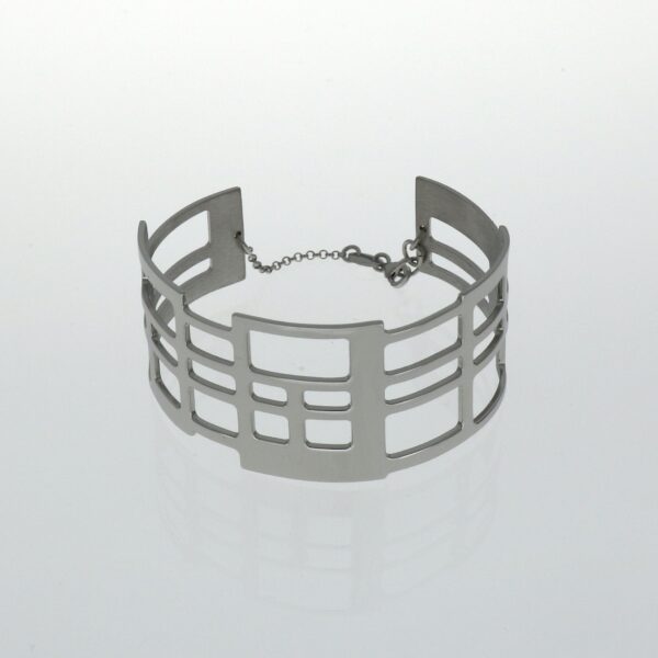 Brazalete rodiado. Con calados rectangulares en diferentes tamaños y posición. 3 cm de ancho, 6 cm de diámetro con cadena de seguridad de 4 cm . Plata de ley de 925 milésimas.