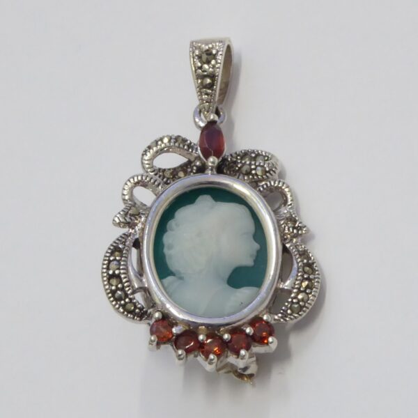 UncategorizedColgante camafeo de marquesitas. Con circonitas de color rubí.Por la parte trasera, lleva pincho de broche, dándole dos utilidades.