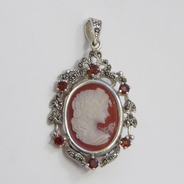 UncategorizedColgante camafeo de marquesitas. Con circonitas de color rubí.Por la parte trasera, lleva pincho de broche, dándole dos utilidades.