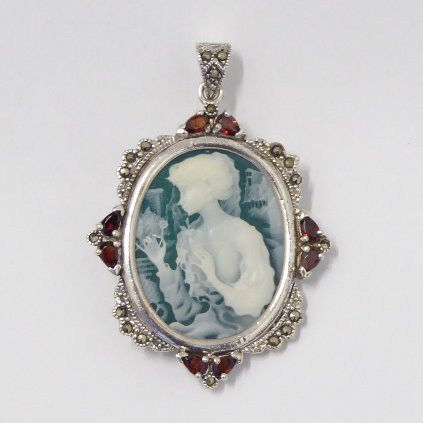 UncategorizedColgante camafeo de marquesitas. Con circonitas de color rubí.Por la parte trasera, lleva pincho de broche, dándole dos utilidades.