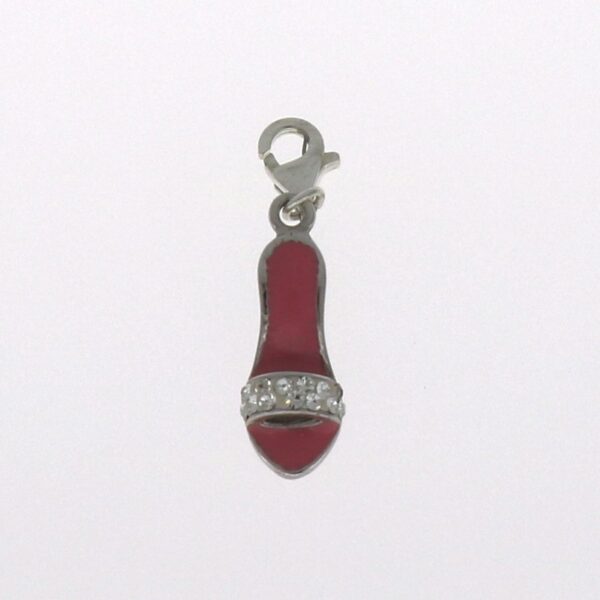 Colgante charm de un zapato esmaltado en rosa y circonitas. 21.65 mm de largo y 7.35 mm de ancho.