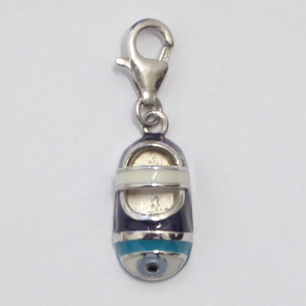 Colgante amuleto, de zapato de bebe con ojo turco en la puntera. Esmaltado en tonos azules.