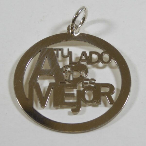 Colgante circular de 28.35 mm de diámetro. Con la frase calada ,LA VIDA A TU LADO ES MEJOR.