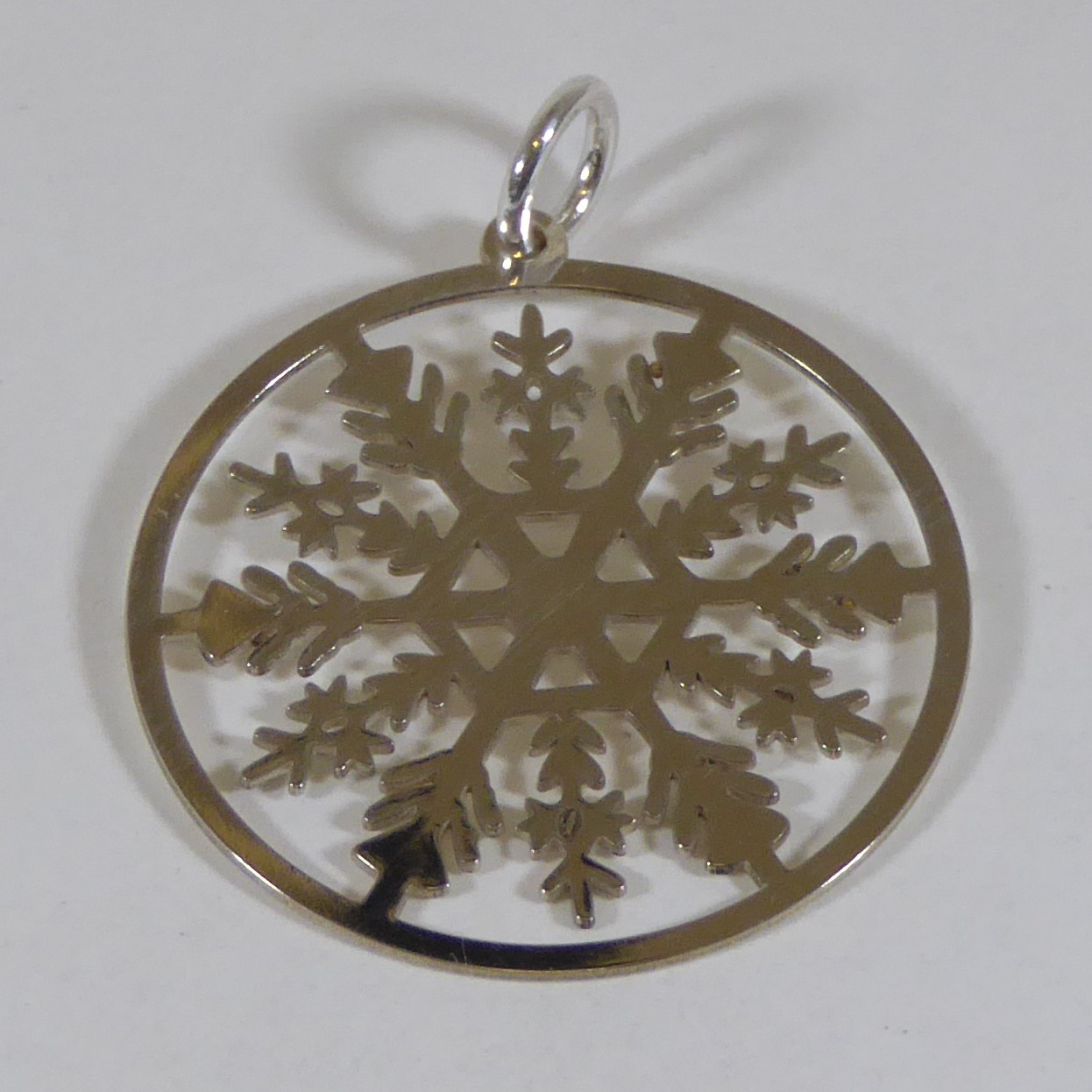 Colgante circular calado, de 28.30 mm de diámetro. Con un copo de nieve en su interior.