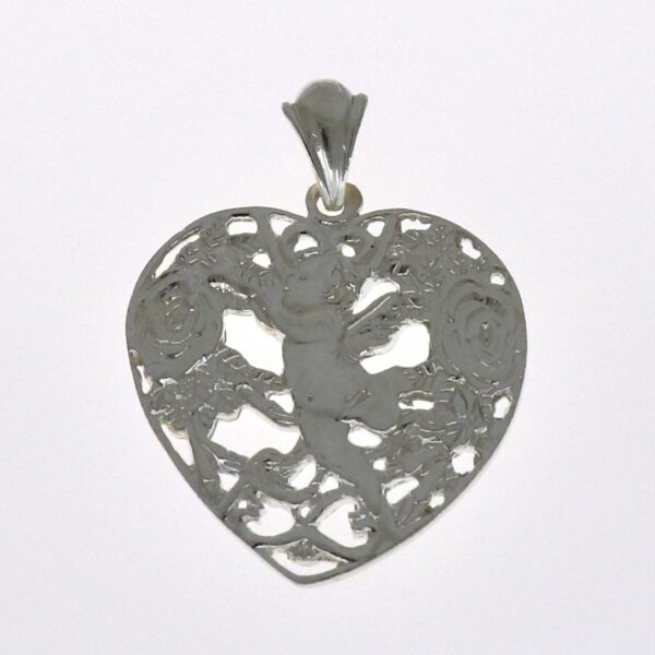 Colgante con forma de corazón calado. Con rosas y un ángel en su interior. 36.45 mm de largo y 33.95 de ancho.