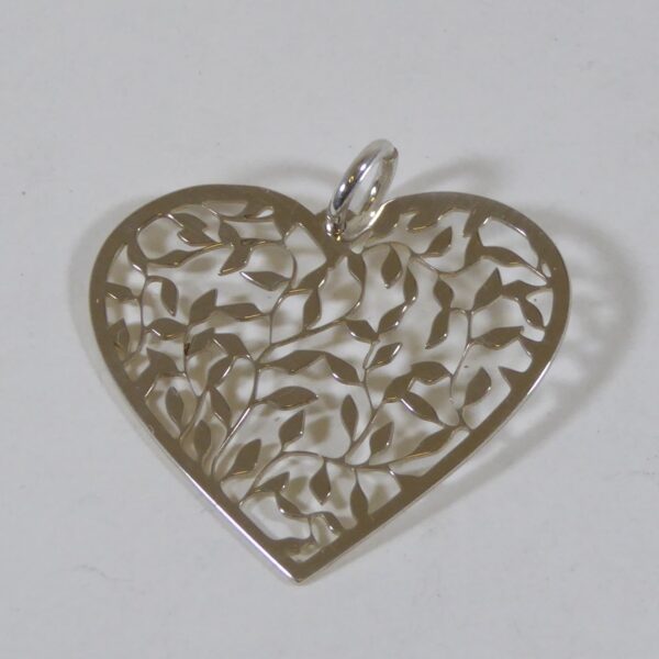 Colgante con forma de corazón. Decorado con hojas caladas en su interior. 27.10 mm de largo y 29.40 mm de ancho.