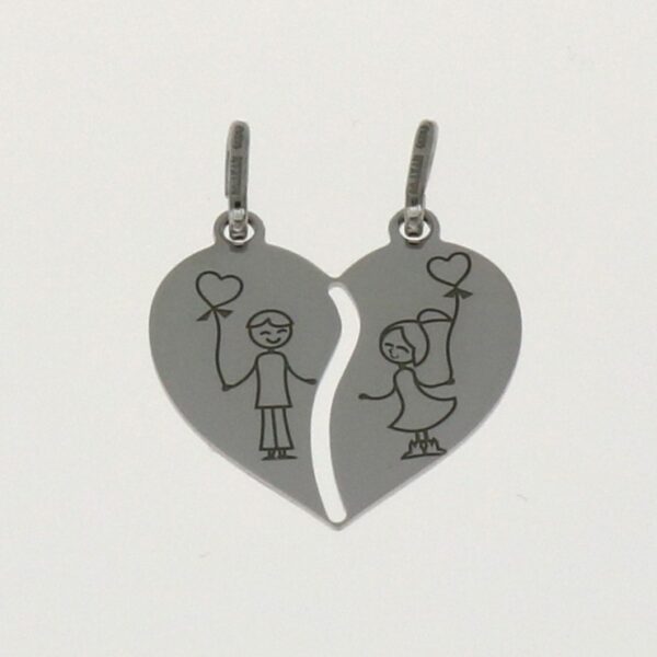 Colgante corazón partido, con un niño en una parte y una niña en la otra. 21.85 mm de largo.