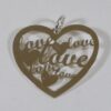Colgante con forma de corazón. Calado en su parte interior con más corazones y la palabra love. 26.90 mm de largo y 28.15 mm de ancho.