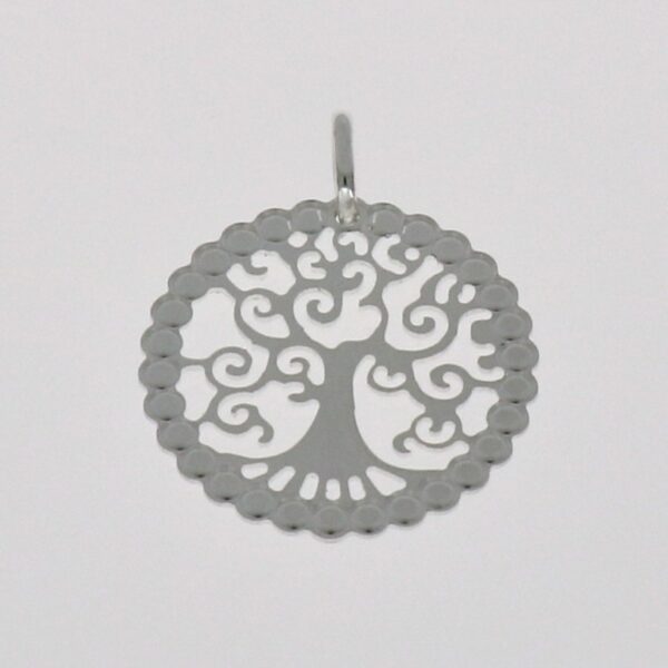 Colgante circular de 25 mm de diámetro.Con árbol de la vida calado en su interior y decorado en el contorno con pequeños círculos.