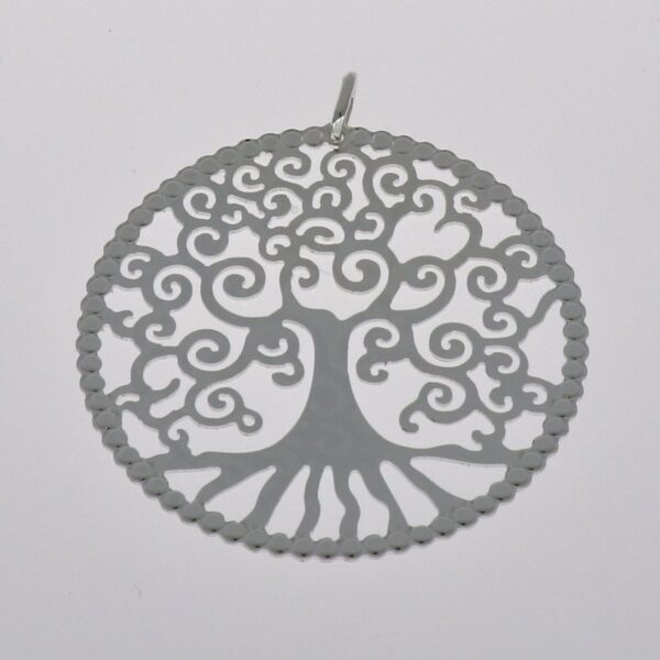Colgante circular de 50.40 mm de diámetro.Con árbol de la vida calado en su interior y decorado en el contorno con pequeños círculos.