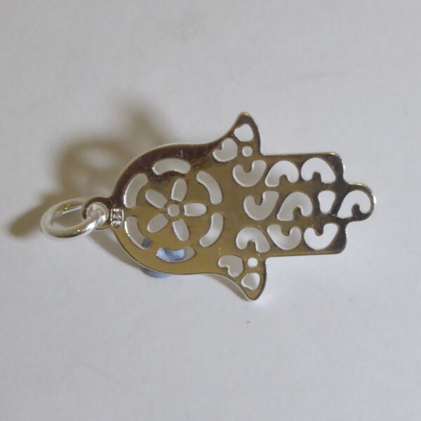Colgante calado, de la Mano de Fátima . 21.85 mm de largo y 14.10 mm de ancho.