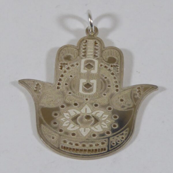 Colgante de la Mano de Fatima. Combina partes lisas y satinadas. 29.50 mm de largo y 26.85 mm de ancho.