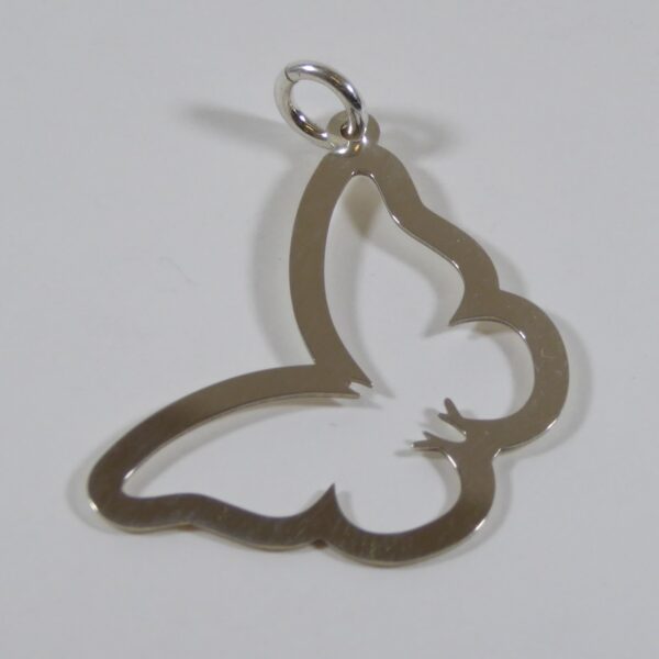 Colgante con la silueta de una mariposa y hueca en su interior.30.70 mm de largo y 19.55 mm de ancho.