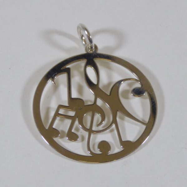 Colgante circular de 26.75 mm de diámetro. Con notas musicales caladas en su interior.