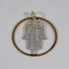 Colgante de la Mano de Fátima calado y con purpurina, en el interior de un círculo chapado.