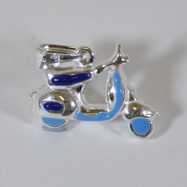 Colgante esmaltado de una moto vespa. Doble cara. 14.10 mm de largo 19.75 mm de ancho.