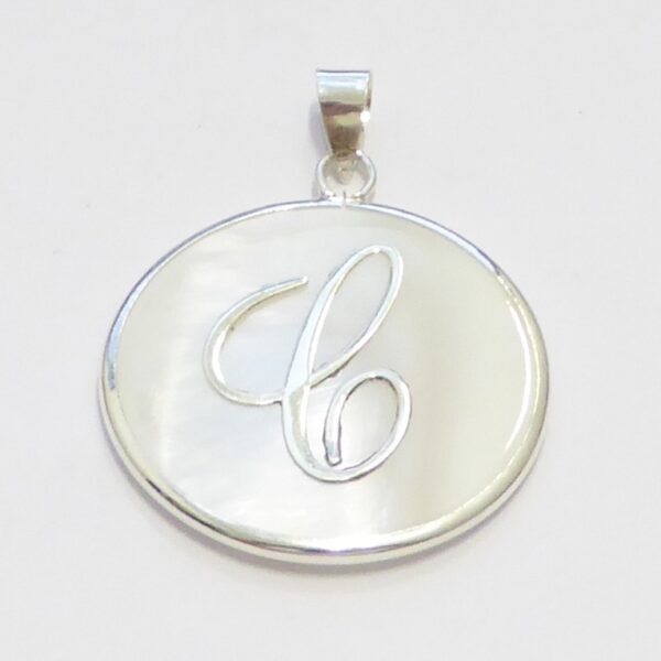 Colgante redondo de nacar con 30.95 mm de diametro y la inicial C.
