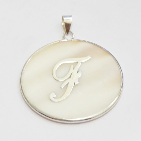 Colgante redondo de nacar con 40.85 mm de diametro y la inicial F.