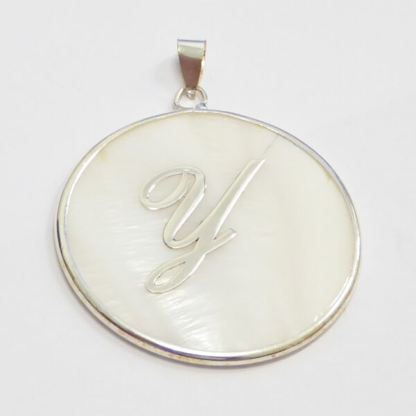 Colgante redondo de nacar con 40.85 mm de diametro y la inicial Y.