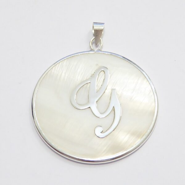 Colgante redondo de nacar con 40.85 mm de diametro y la inicial G.