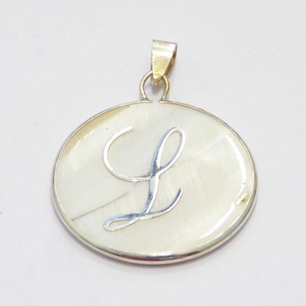 Colgante redondo de nacar con 30.95 mm de diametro y la inicial L.