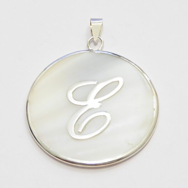 Colgante redondo de nacar con 40.85 mm de diametro y la inicial E.