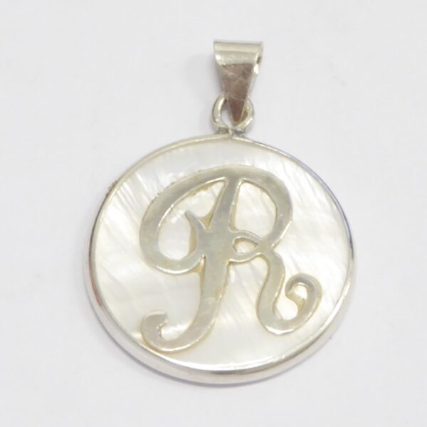 Colgante redondo de nacar con 20.25 mm de diametro y la inicial R.