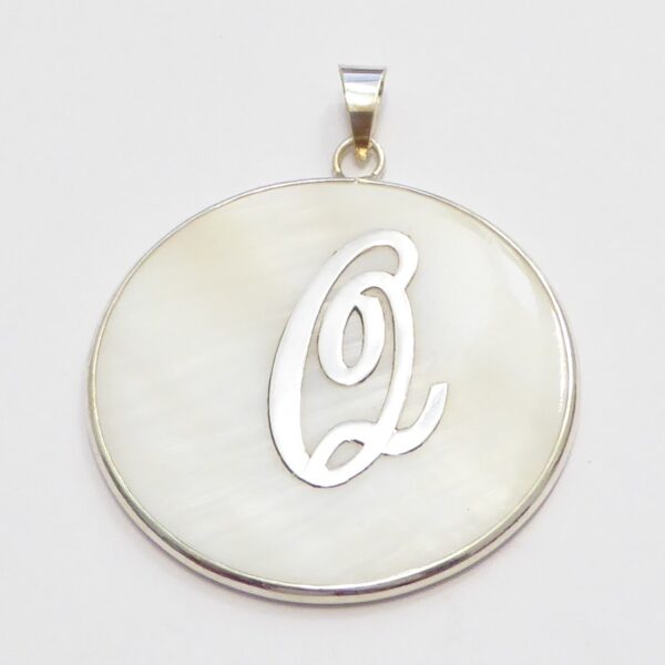 Colgante redondo de nacar con 40.85 mm de diametro y la inicial Q Plata de ley de 925 milésimas