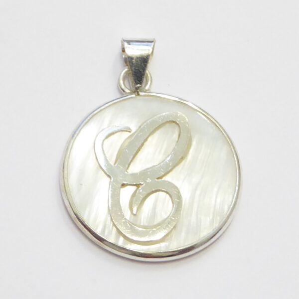 Colgante redondo de nacar con 20.25 mm de diametro y la inicial C Plata de ley de 925 milésimas.