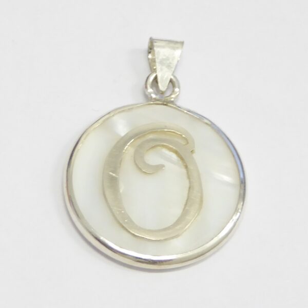 Colgante redondo de nacar con 20.25 mm de diametro y la inicial O Plata de ley de 925 milésimas.