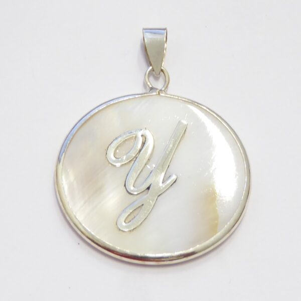 Colgante redondo de nacar con 30.95 mm de diametro y la inicial Y.