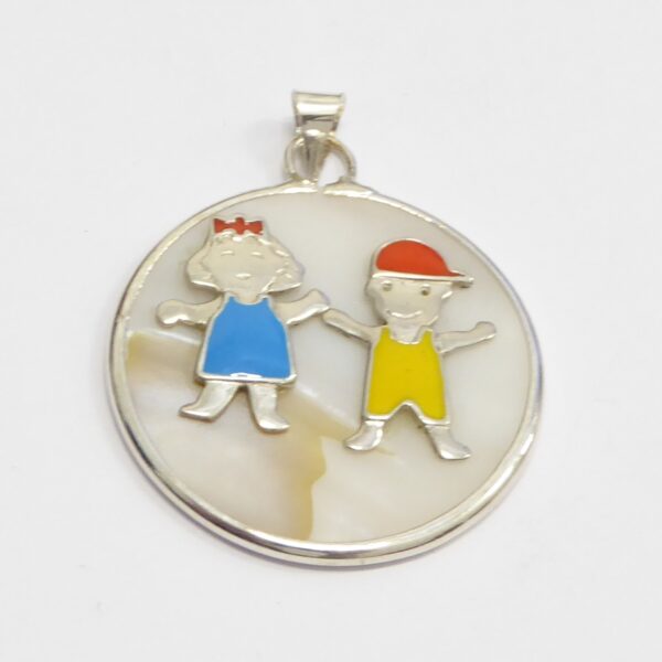 Colagante de nácar de 30.65 mm de diámetro. Con una niña y un niño esmaltado.