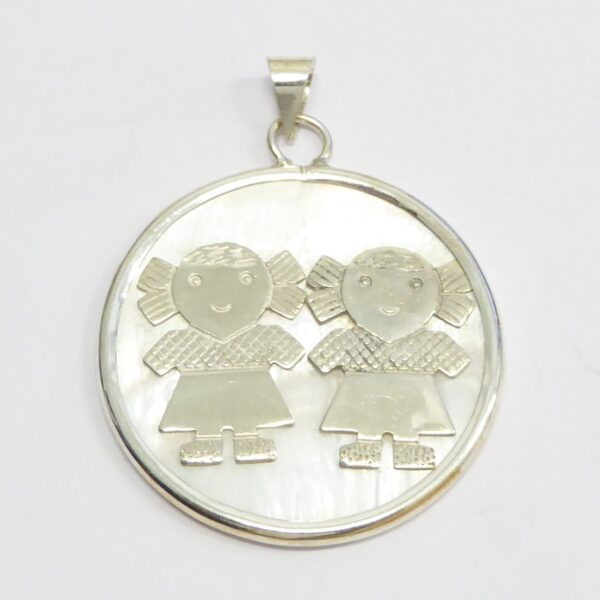 Colgante redondo de nacar con 30.90 mm de diametro y dos niñas .