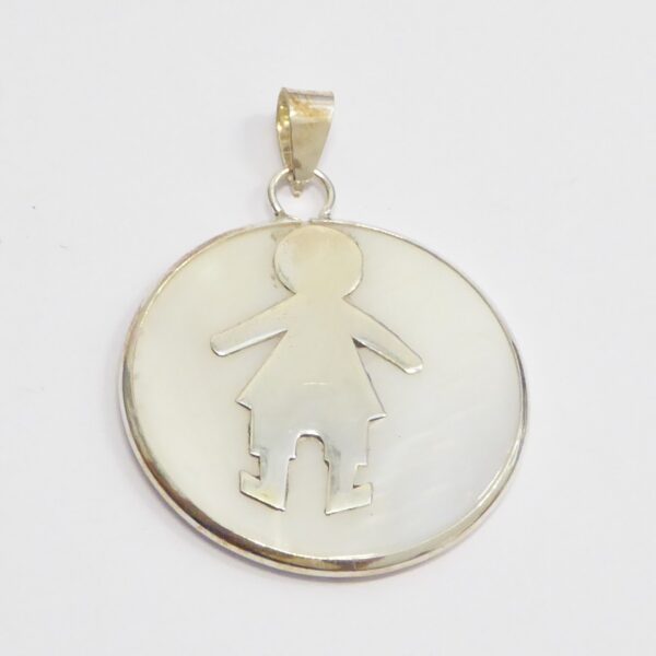UncategorizedColgante redondo de nacar con 31.55 mm de diámetro y un niño en el centro .
