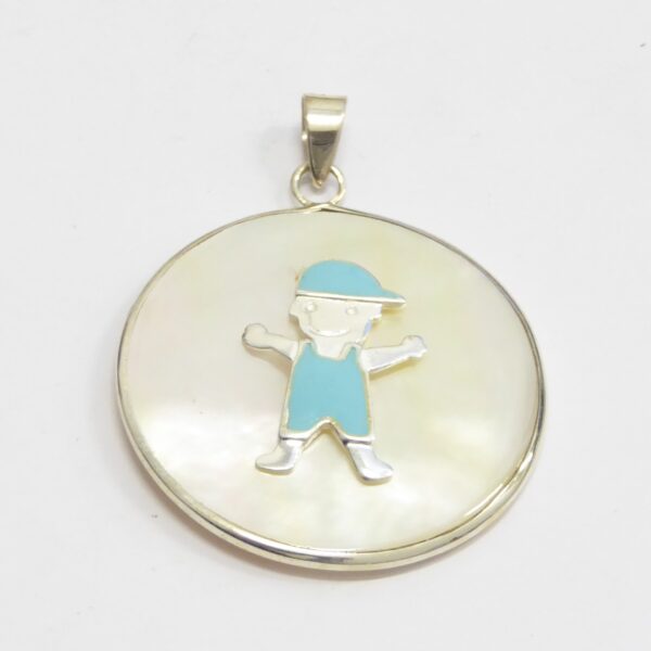UncategorizedColgante de nácar de 29.75 mm de diámetro. Con un niño esmaltado en el centro.