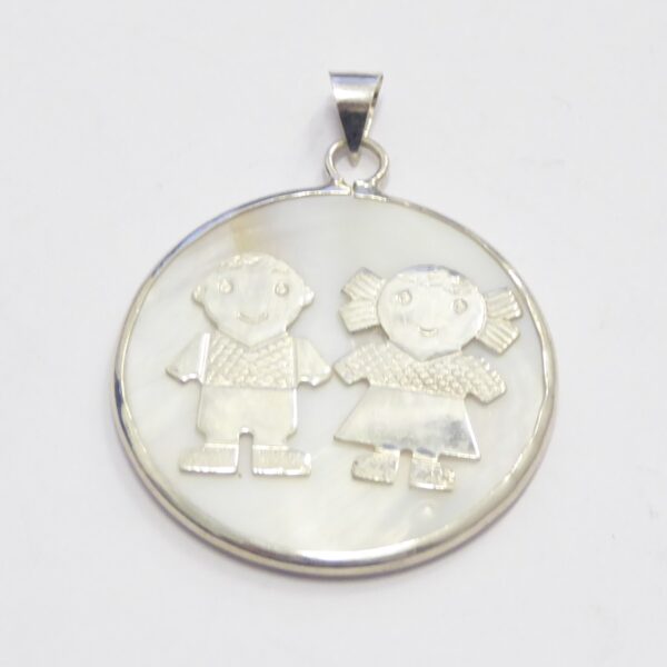 Colgante redondo de nacar con 31.35 mm de diámetro ,con un niño y una niña.